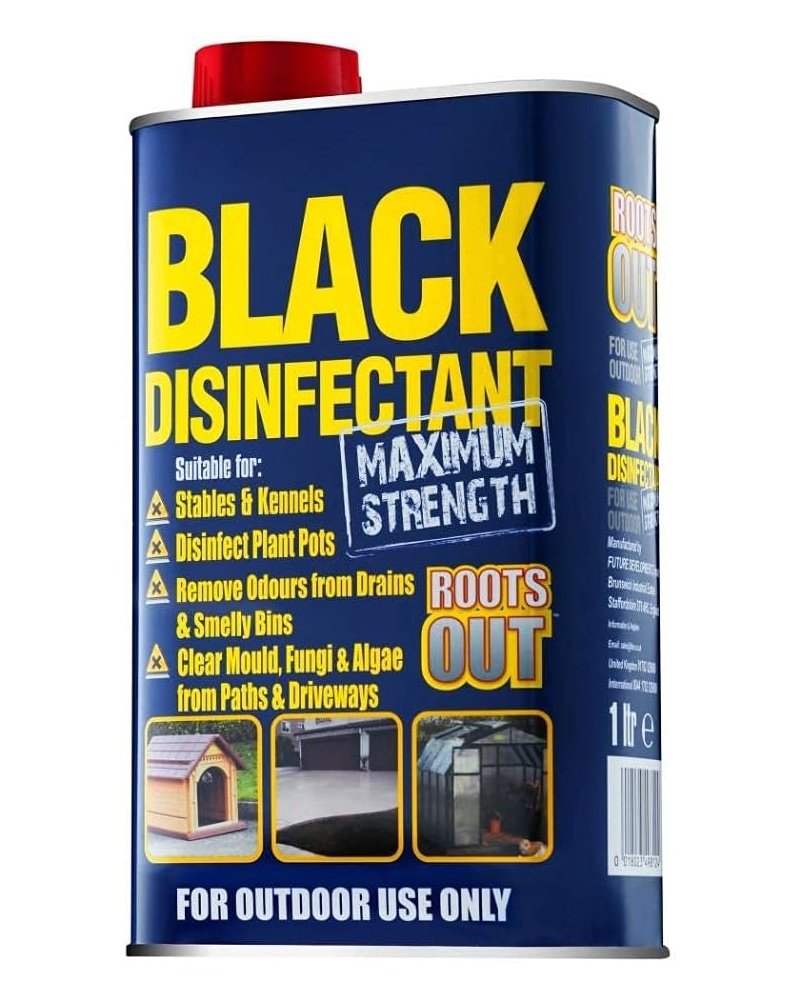 Roots Out Black DisinfectantCleans Smelly drains Stables and Chicken coups. Removes Moss and Algae from driveways 1 Litre, 1 L (Pack of 1)